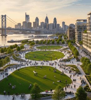Delaware Riverfront development For decades, the Delaware River waterfront was a shadow of its former self—a ribbon of post-industrial neglect, cut off from its vibrant cities b...